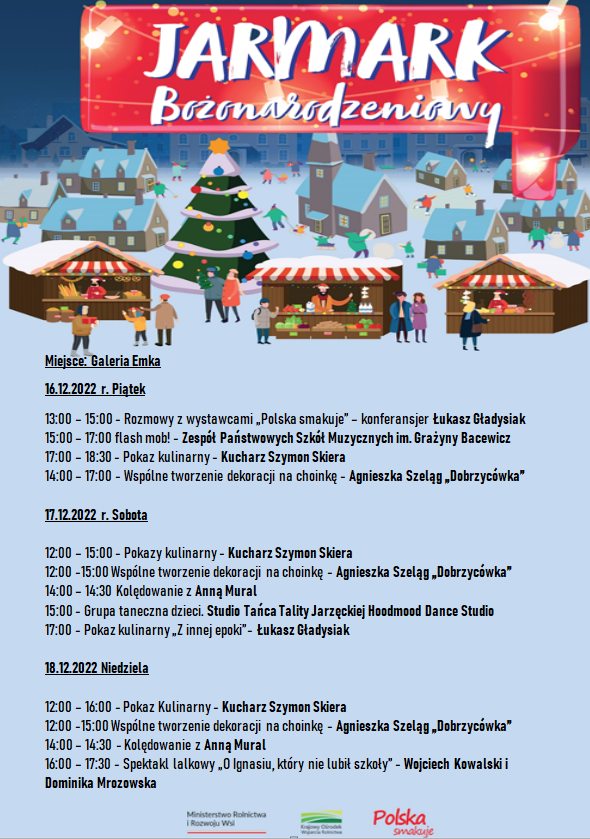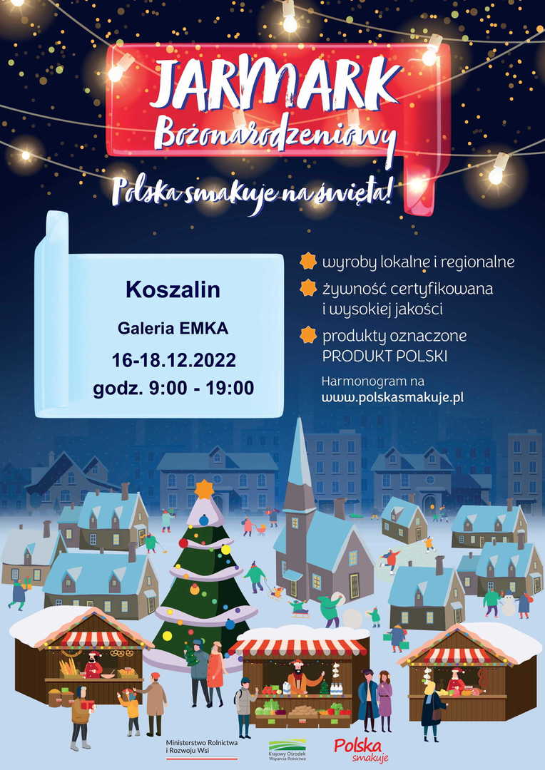 W dniach 16 – 18 grudnia Galeria Emka zaprasza wszystkich swoich klientów na Świąteczny Jarmark Bożonarodzeniowy „Polska smakuje” organizowany przez KOWR OT Koszalin. Podczas wydarzenia będzie można nabyć wiele świątecznych przysmaków, ręcznie wykonanych ozdób choinkowych od Kół Gospodyń Wiejskich, a także regionalne wyroby „Polska smakuje” m.in.: naturalne wędliny, sery, wyroby cukiernicze, miody i produkty pszczele z okolicznych pasiek oraz przetwory owocowo-warzywne.