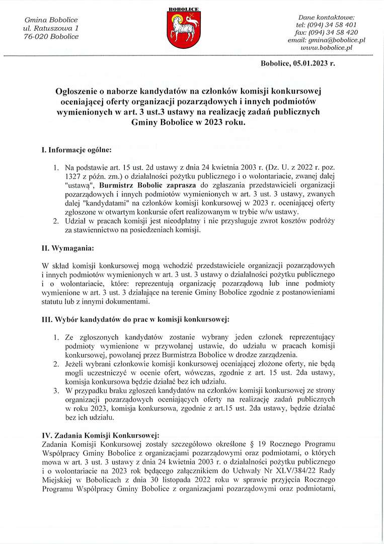 - Na podstawie art. 15 ust. 2d ustawy z dnia 24 kwietnia 2003 r. (Dz. U. z 2022 r. poz. 1327 z późn. zm.) o działalności pożytku publicznego i o wolontariacie, zwanej dalej "ustawą", Burmistrz Bobolic zaprasza do zgłaszania przedstawicieli organizacji pozarządowych i innych podmiotów wymienionych w art. 3 ust. 3 ustawy, zwanych dalej "kandydatami" na członków komisji konkursowej w 2023 r. oceniającej oferty zgłoszone w otwartym konkursie ofert realizowanym w trybie w/w ustawy.