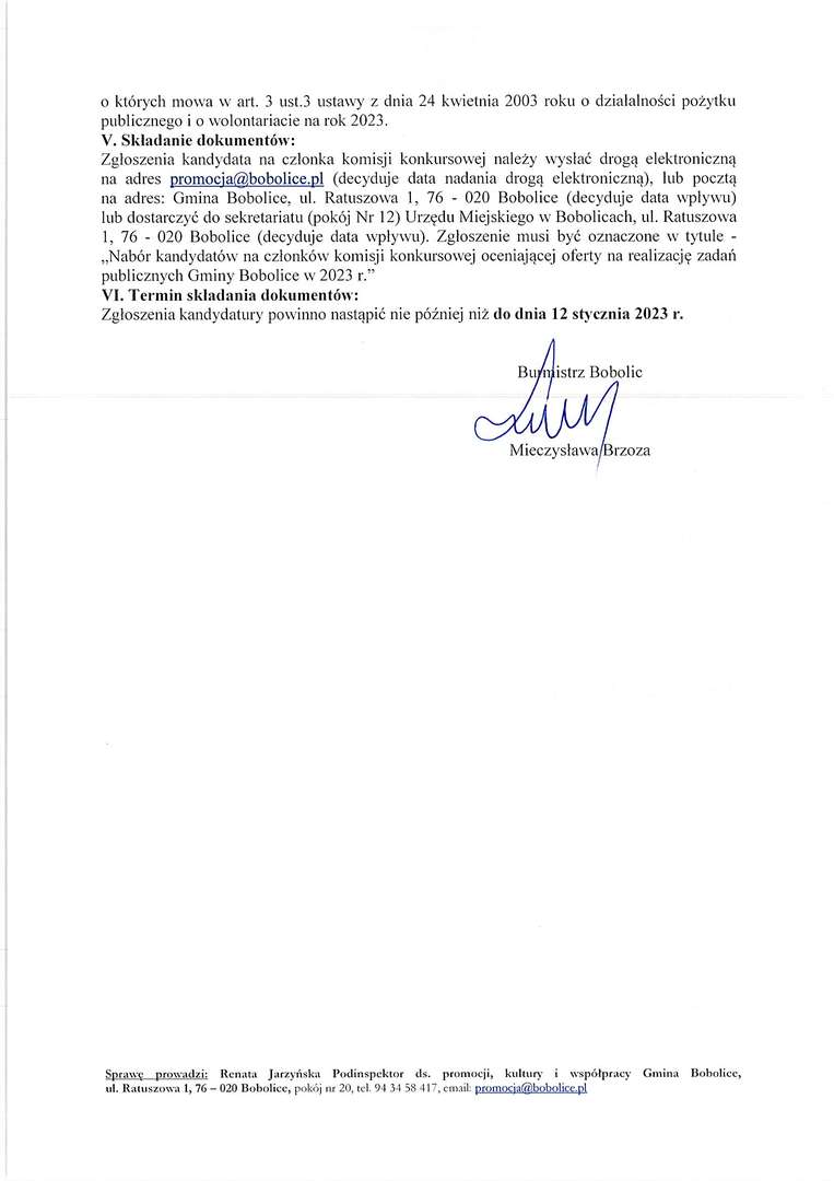 lub dostarczyć do sekretariatu (pokój Nr 12) Urzędu Miejskiego w Bobolicach, ul. Ratuszowa 1, 76 - 020 Bobolice (decyduje data wpływu). Zgłoszenie musi być oznaczone w tytule - „Nabór kandydatów na członków komisji konkursowej oceniającej oferty na realizację zadań publicznych Gminy Bobolice w 2023 r.”