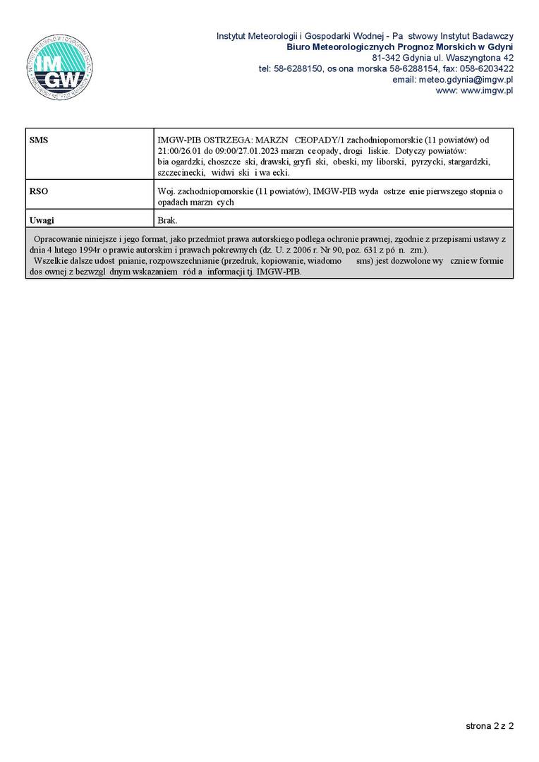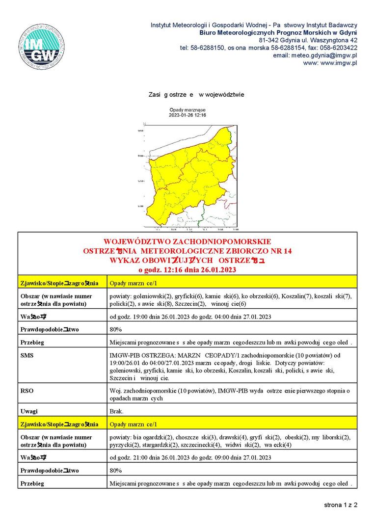 UWAGA: Zjawisko / Stopień zagrożenia: Opady marznące od godz. 19.00 dnia 26.01.2023 r. do godz. 04.00 dnia 27.01.2023 r.