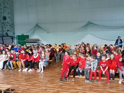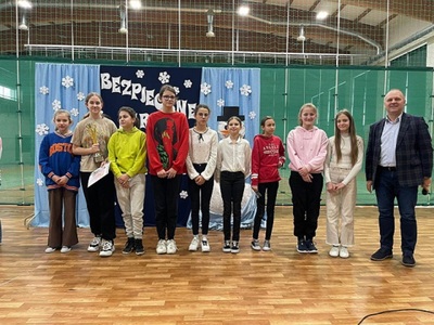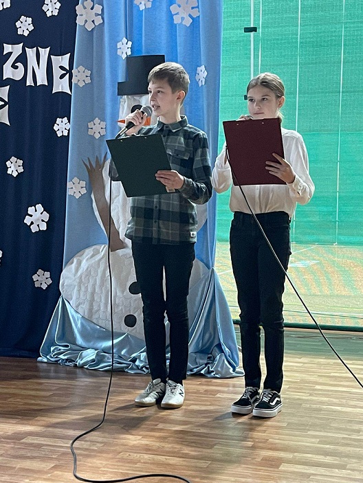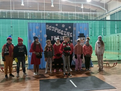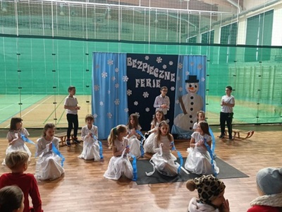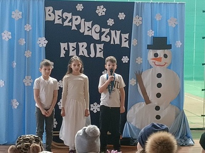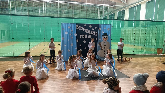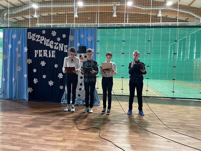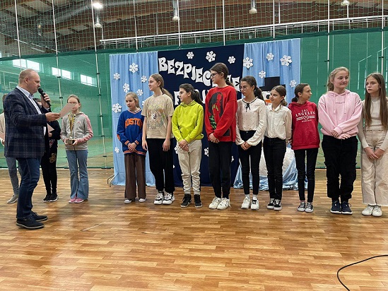 Na zakończenie wystąpił dyrektor szkoły, p. Dariusz Michalak , który wręczył uczniom dyplomy i puchary za osiągnięcia sportowe , podziękował przedstawicielom Straży Miejskiej za cenne rady na” zimowe wypady” i życzył wszystkim udanych i bezpiecznych ferii zimowych.
