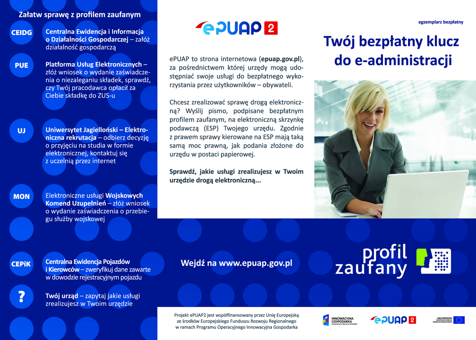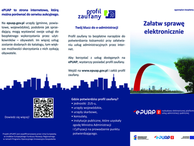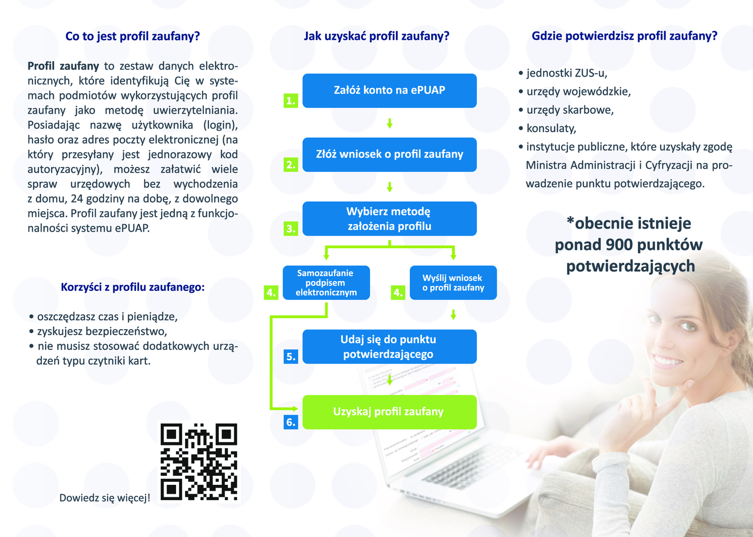 Aby potwierdzić profil zaufany wystarczy wcześniej założyć konto na platformie ePUAP (www.epuap.gov.pl) i złożyć wniosek o profil zaufany.