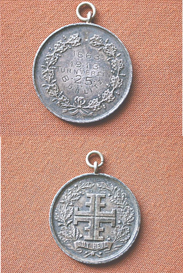 Symbolem tego stowarzyszenia jest Turnerkreuz – krzyż gimnastyczny stworzony w 1844 roku przez grawera i drukarza Johanna Heinricha Felsinga (1800–1875) z Darmstadt w Hesji. Składa się z czterech lustrzanie odbitych dużych liter F, tworzących krzyż grecki. Reprezentują one motto: Frisch (świeży), Fromm (pobożny), Fröhlich (szczęśliwy), Frei (swobodny, wolny). Taki krzyż znajdziemy na metce przedstawianej koszulki. Członkowie Deutsche Turnerschaft (D.T.) – Niemieckie Towarzystwo Gimnastyczne, będące organizacją patronacką cywilnych klubów gimnastycznych w Niemczech, pozdrawiali się również hasłem Gut Heil (bezpieczny i zdrowy).