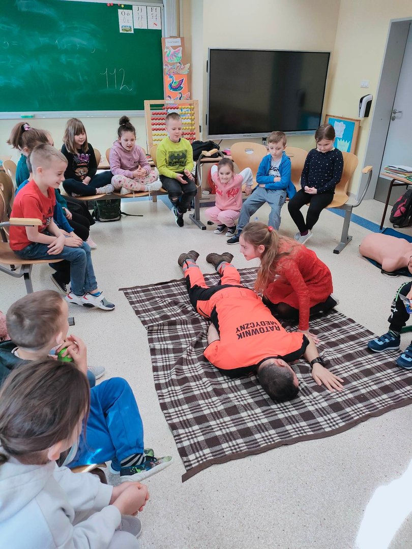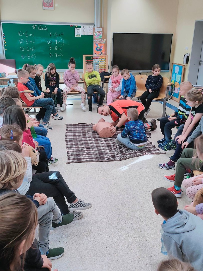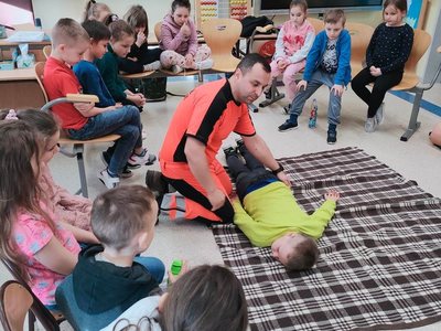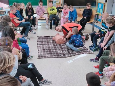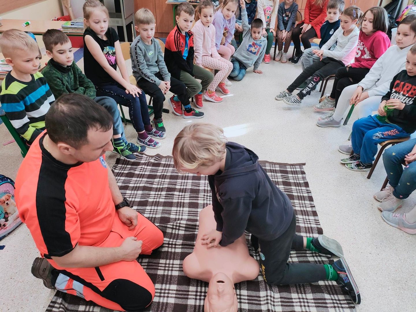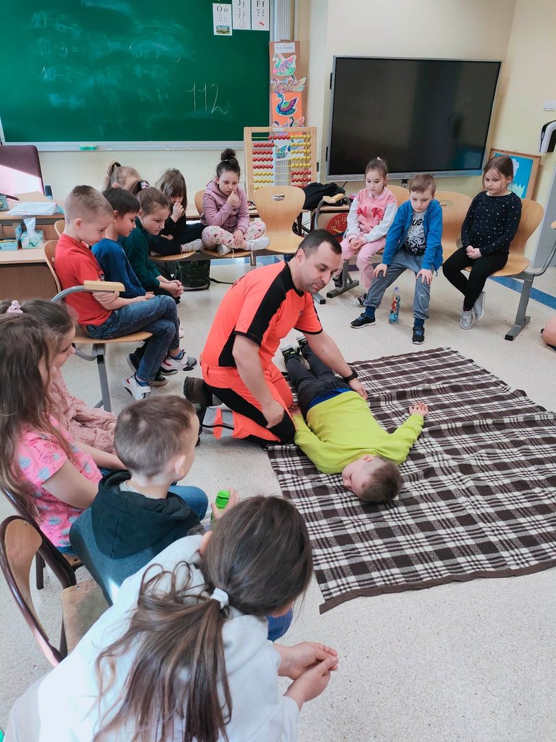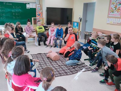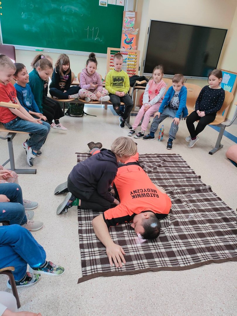 9 lutego 2023 roku uczniowie klas IA i IC Szkoły Podstawowej im. Henryka Sienkiewicza w Bobolicach wzięli udział w spotkaniu z ratownikiem medycznym Panem Jarkiem Bączkowskim. Celem było pokazanie dzieciom jak należy pomóc nieprzytomnej osobie. Nauczyli się obracać poszkodowanego z brzucha na plecy, ułożyć człowieka w pozycji bezpiecznej do czasu przyjazdu karetki oraz co robić, gdy ktoś zasłabnie. Poćwiczyli na fantomieresuscytację. Zajęcia były bardzo ciekawe. Dzieci uważnie słuchały i mocno się zdziwiły, gdy w ćwiczeniach drobny chłopczyk z pierwszej klasy bez problemu obrócił z brzucha na plecy naszego Pana ratownika. Dziękujemy Panu Jarkowi.