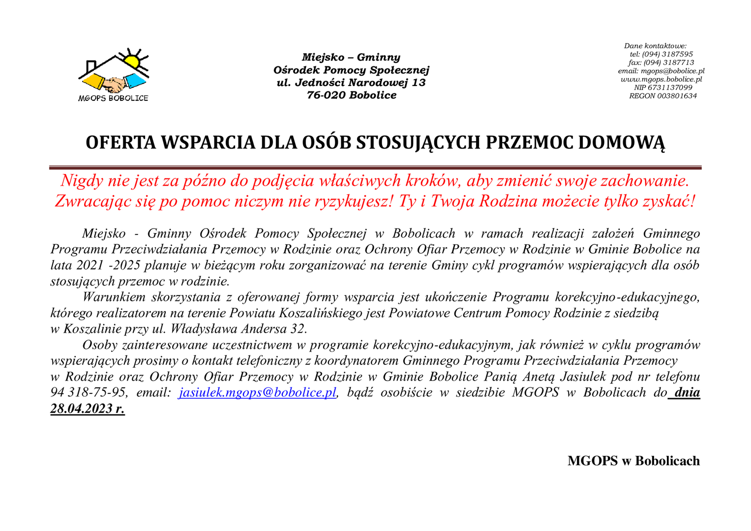 Osoby zainteresowane uczestnictwem w programie korekcyjno-edukacyjnym, jak również w cyklu programów wspierających prosimy o kontakt telefoniczny z koordynatorem Gminnego Programu Przeciwdziałania Przemocy w Rodzinie oraz Ochrony Ofiar Przemocy w Rodzinie w Gminie Bobolice Panią Anetą Jasiulek pod nr telefonu 94 318-75-95, email: jasiulek.mgops@bobolice.pl, bądź osobiście w siedzibie MGOPS w Bobolicach do dnia 28.04.2023 r.