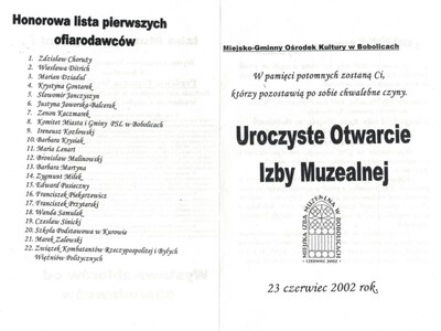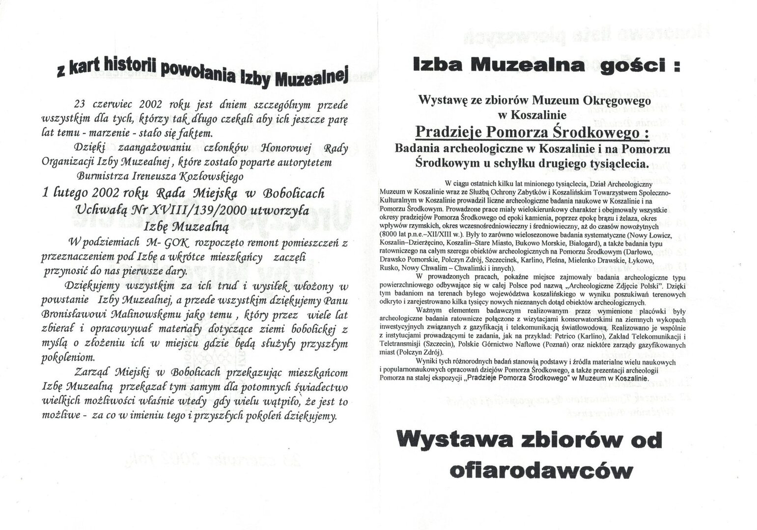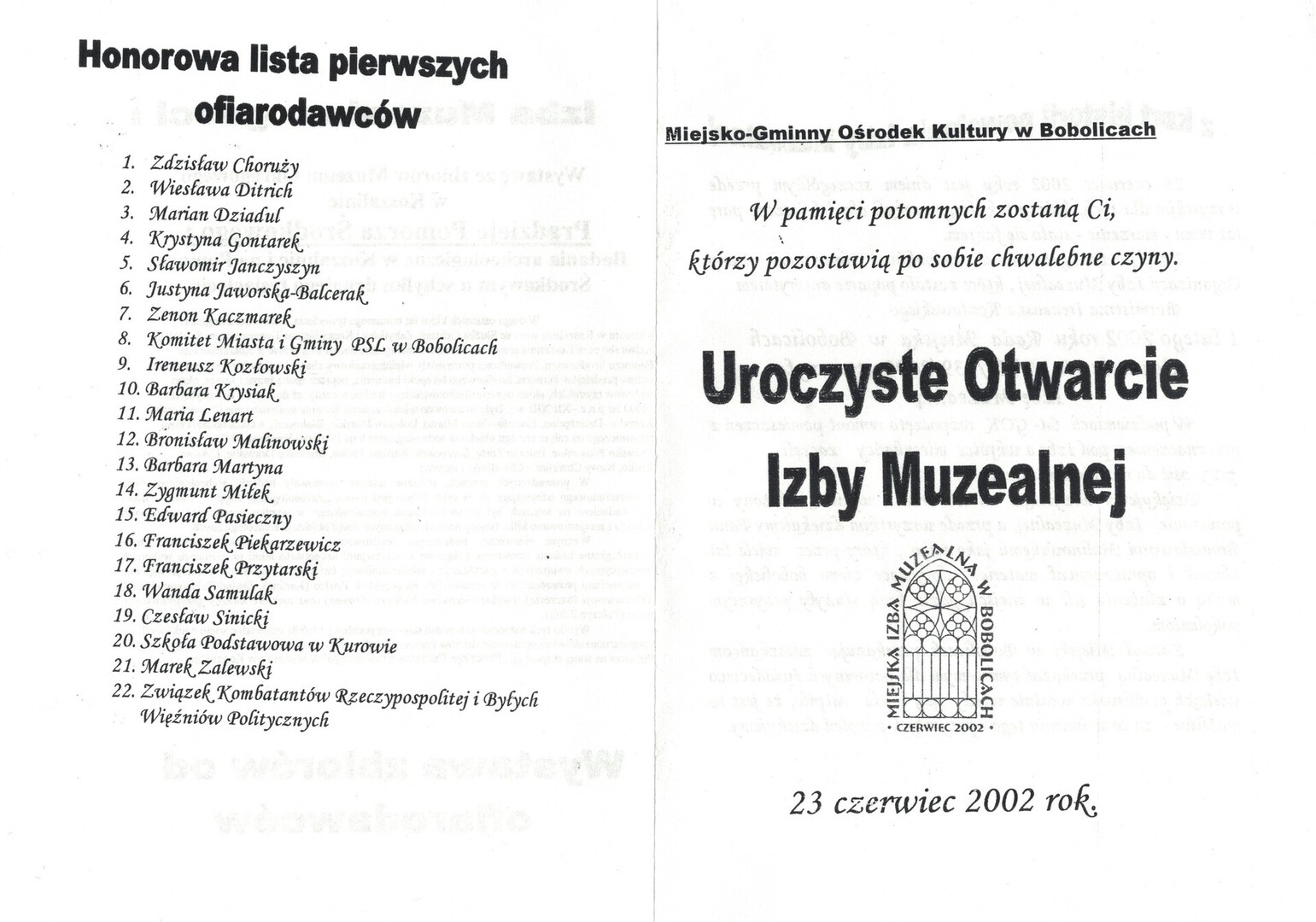 23 czerwca 2002 roku, a więc dokładnie 21 lat temu, uroczyście otwarto Miejską Izbę Muzealną w Bobolicach - powołaną uchwałą Rady Miejskiej w Bobolicach Nr XVIII/139/2000 z dnia 1 lutego 2000 roku.