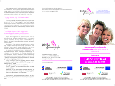 Projekt realizowany w ramach Europejskiego Funduszu Społecznego ma na celu zwiększenie zgłaszalności kobiet w wieku 50-69 lat do populacyjnego programu wczesnego wykrywania raka piersi prowadzonego metodą mammografii przesiewowej na terenie województwa Zachodniopomorskiego.