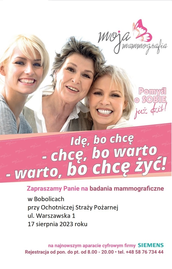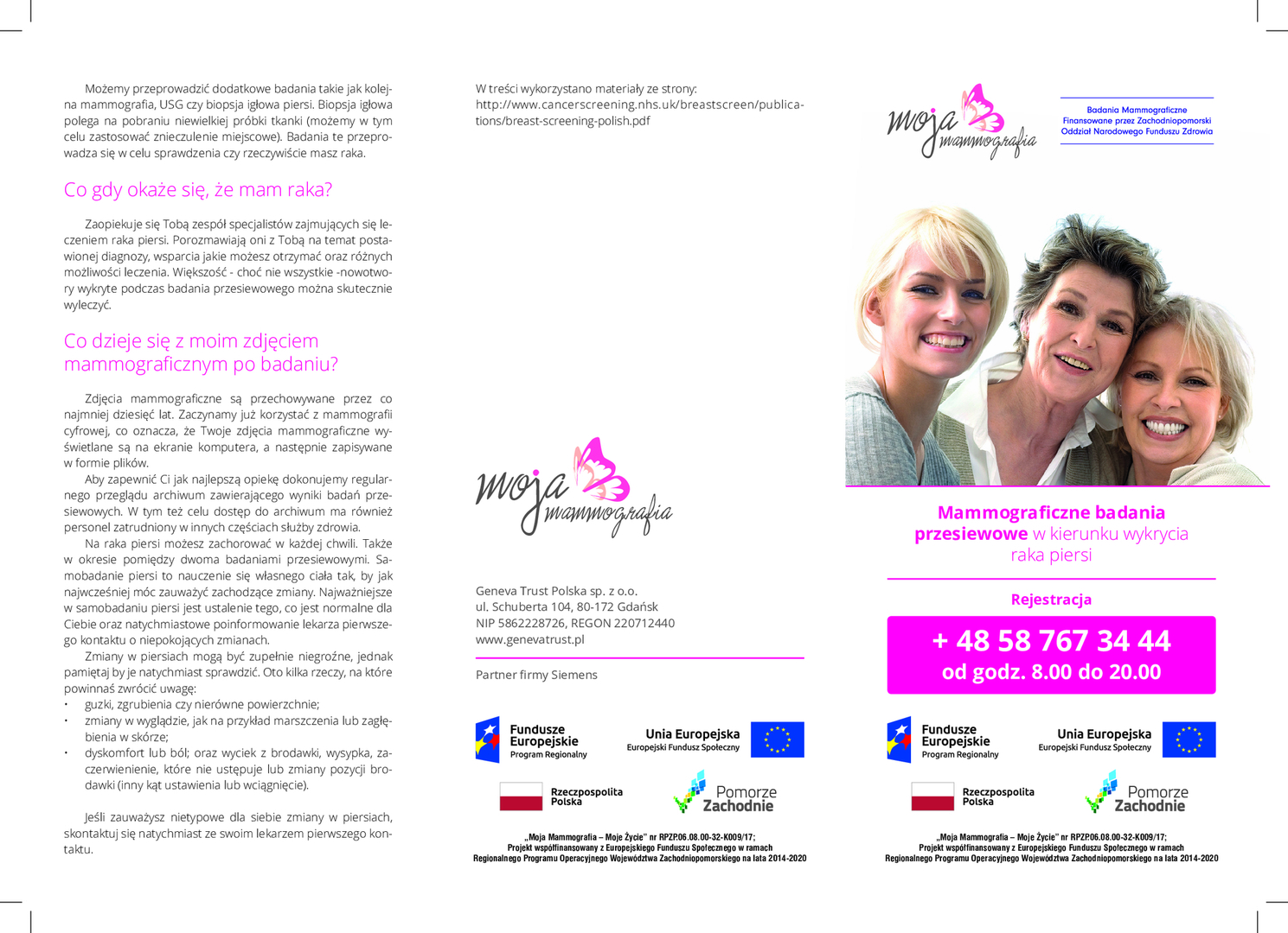 Geneva Trust Polska Spółka z o. o. Niepubliczny Zakład Opieki Zdrowotnej Profilaktyka i Diagnostyka zaprasza mieszkanki gminy Bobolice na bezpłatne badania mammograficzne w ramach Programu Profilaktyki Raka Piersi – Etap Podstawowy finansowany przez Zachodniopomorski Oddział Wojewódzki Narodowego Funduszu Zdrowia oraz Europejski Fundusz Społeczny w ramach Regionalnego Programu Operacyjnego Województwa Zachodniopomorskiego 2014-2022