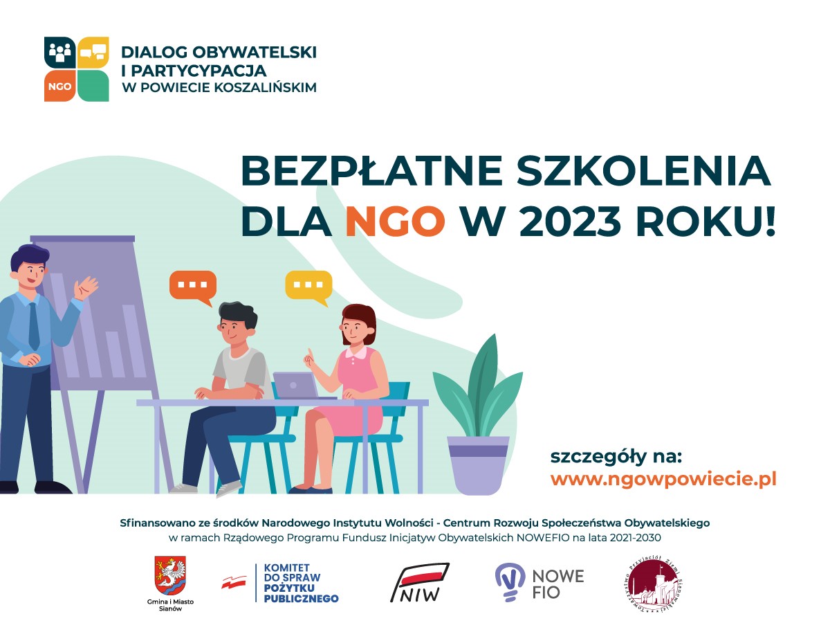 Towarzystwo Przyjaciół Ziemi Sianowskiej zaprasza organizacje pozarządowe z terenu Powiatu Koszalińskiego do skorzystania z bezpłatnych szkoleń organizowanych w ramach projektu pn. „Dialog obywatelski i partycypacja w Powiecie Koszalińskim”.Przedsięwzięcie dofinansowane jest ze środków Narodowego Instytutu Wolności – Centrum Rozwoju Społeczeństwa Obywatelskiego w ramach Rządowego Programu Fundusz Inicjatyw Obywatelskich NOWEFIO na lata 2021-2030.