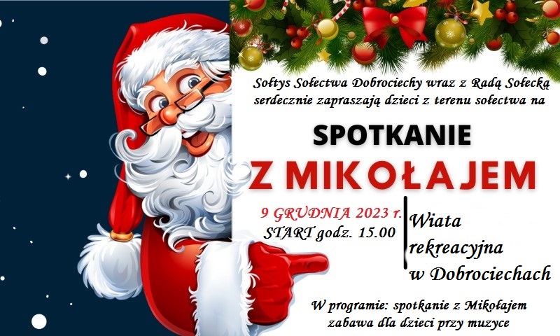 Sołtys Sołectwa Dobrociechy wspólnie z Radą Sołecką zapraszają dzieci z Sołectwa Dobrociechy na ,,Spotkanie z Mikołajem" - 9 grudnia godz. 15.00 - Wiata rekreacyjna w Dobrociechach