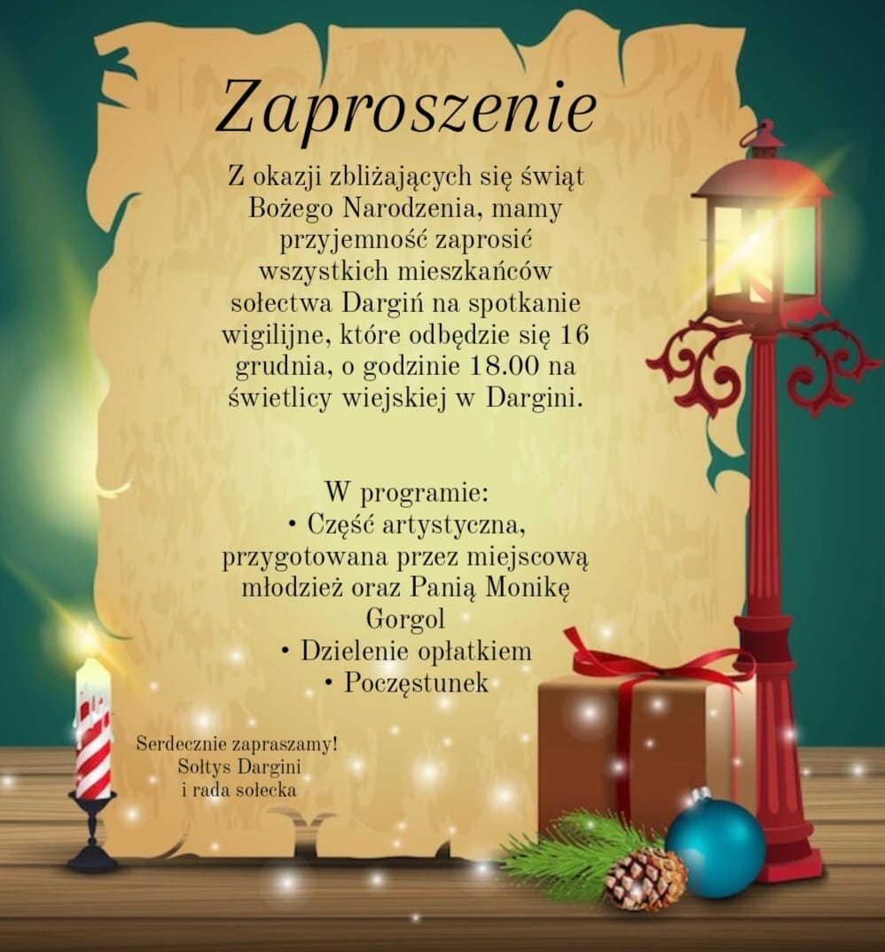 Sołtys Sołectwa Dargiń wraz z Radą Sołecką serdecznie zapraszają na Wigilię Sołecką. Spotkanie odbędzie się na świetlicy wiejskiej w Dargini w dniu 16 grudnia o godz. 18.00. W programie: program artystyczny przygotowany przez Panią Monikę Gorgol, dzielenie opłatkiem oraz poczęstunek.