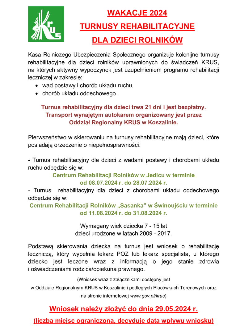 Kasa Rolniczego Ubezpieczenia Społecznego organizuje kolonijne turnusy rehabilitacyjne dla dzieci rolników uprawnionych do świadczeń KRUS, na których aktywny wypoczynek jest uzupełnieniem programu rehabilitacji leczniczej w zakresie: