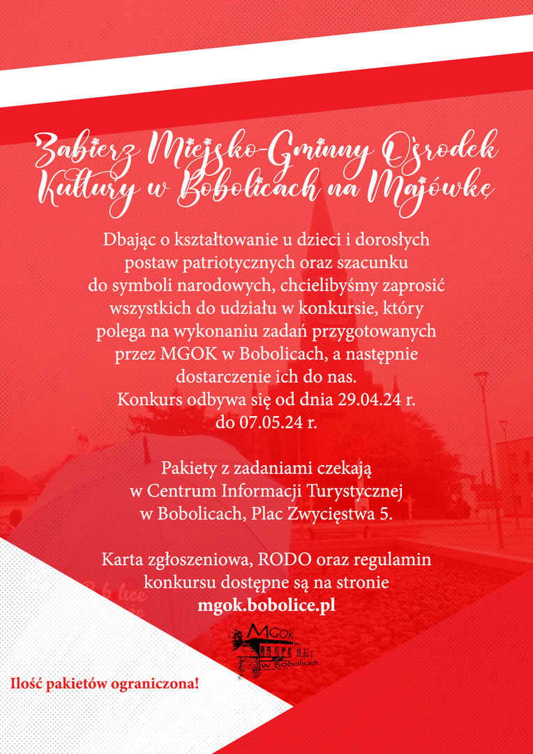 Organizatorem konkursu jest Miejsko-Gminny Ośrodek Kultury w Bobolicach. Konkurs skierowany jest do dorosłych oraz dzieci i młodzieży z terenu Gminy Bobolice. Konkurs odbywa się od dnia 29.04.24 r. do 07.05.24 r. 5. Celem Konkursu jest kształtowanie u dzieci i dorosłych postaw patriotycznych oraz szacunku do symboli narodowych. Warunkiem uczestnictwa w Konkursie jest pobranie zgłoszenia wraz z przygotowanym pakietem zadań pt.”Majówka z MGOK”.