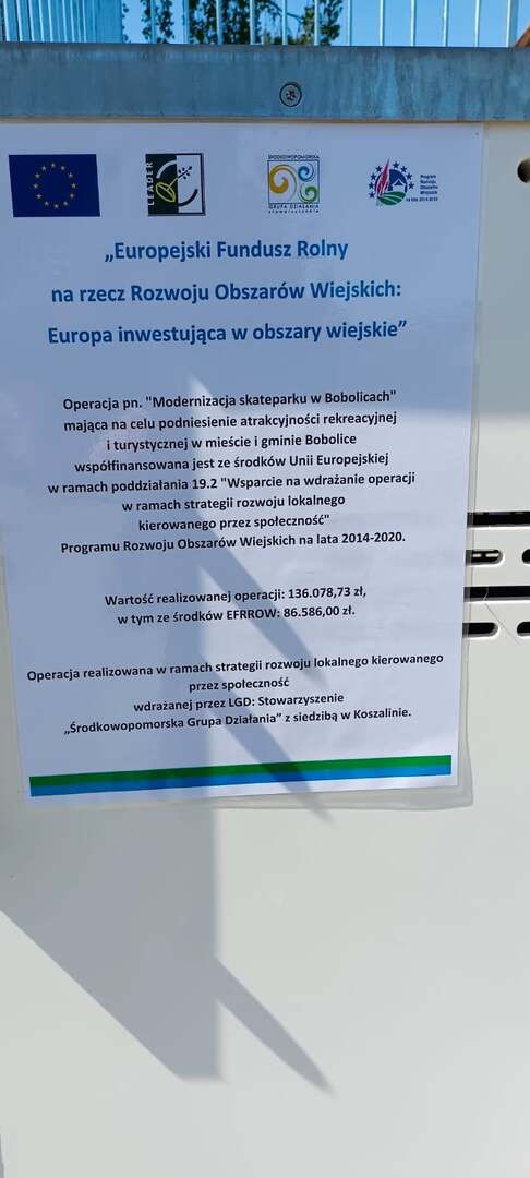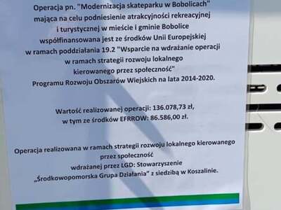 Projekt pn. "Modernizacja skateparku w Bobolicach" zrealizowany w ramach pozyskanego dofinansowania w wysokości 86.586 zł
