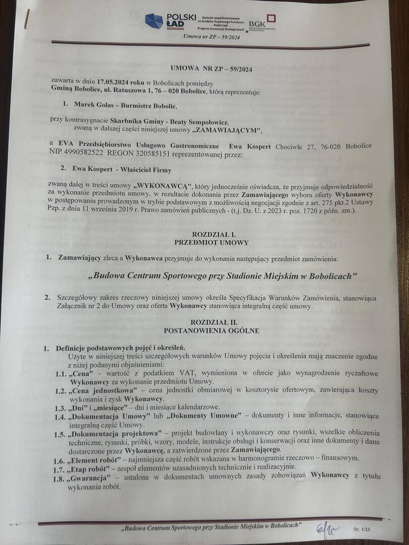 Dzięki wsparciu Rządowego Funduszu: Polski Ład w dniu dzisiejszym, tj. 17 maja 2024 r. Gmina Bobolice podpisała umowę na „Budowę Centrum Sportowego przy Stadionie miejskim w Bobolicach” z firmą, której oferta została wyłoniona jako najkorzystniejsza w drugim przetargu.