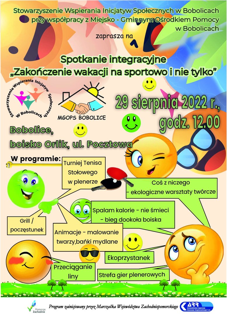 Stowarzyszenie Wspierania Inicjatyw Społecznych w Bobolicach wspólnie z Miejsko - Gminnym Ośrodkiem Pomocy Społecznej w Bobolicach serdecznie zapraszają na spotkanie integracyjne "Zakończenie wakacji na sportowo i nie tylko", które odbędzie się 29 sierpnia o godz. 12.00 na boisku przy ul. Pocztowej.