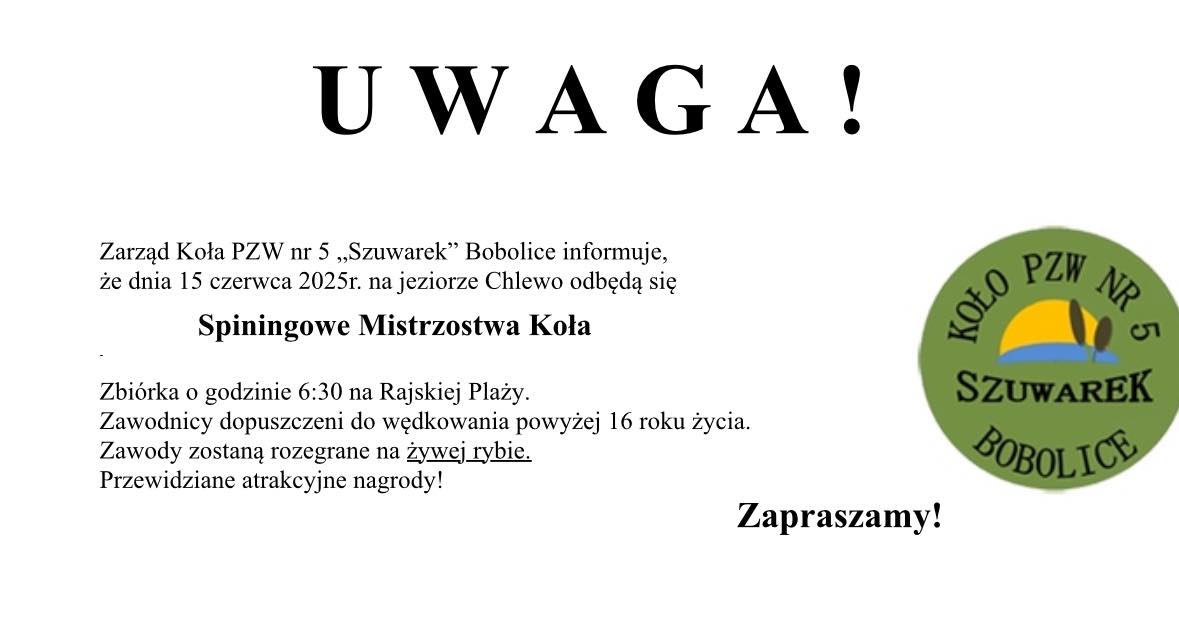 PZW Szuwarek Bobolice serdecznie zaprasza na Sparingowe Mistrzostwa Koła na jeziorze Chlewo Wielkie.