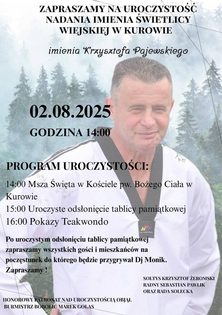 serdecznie zapraszają na Uroczystość Nadania Imienia Świetlicy Wiejskiej w Kurowie imienia Krzysztofa Pajewskiego