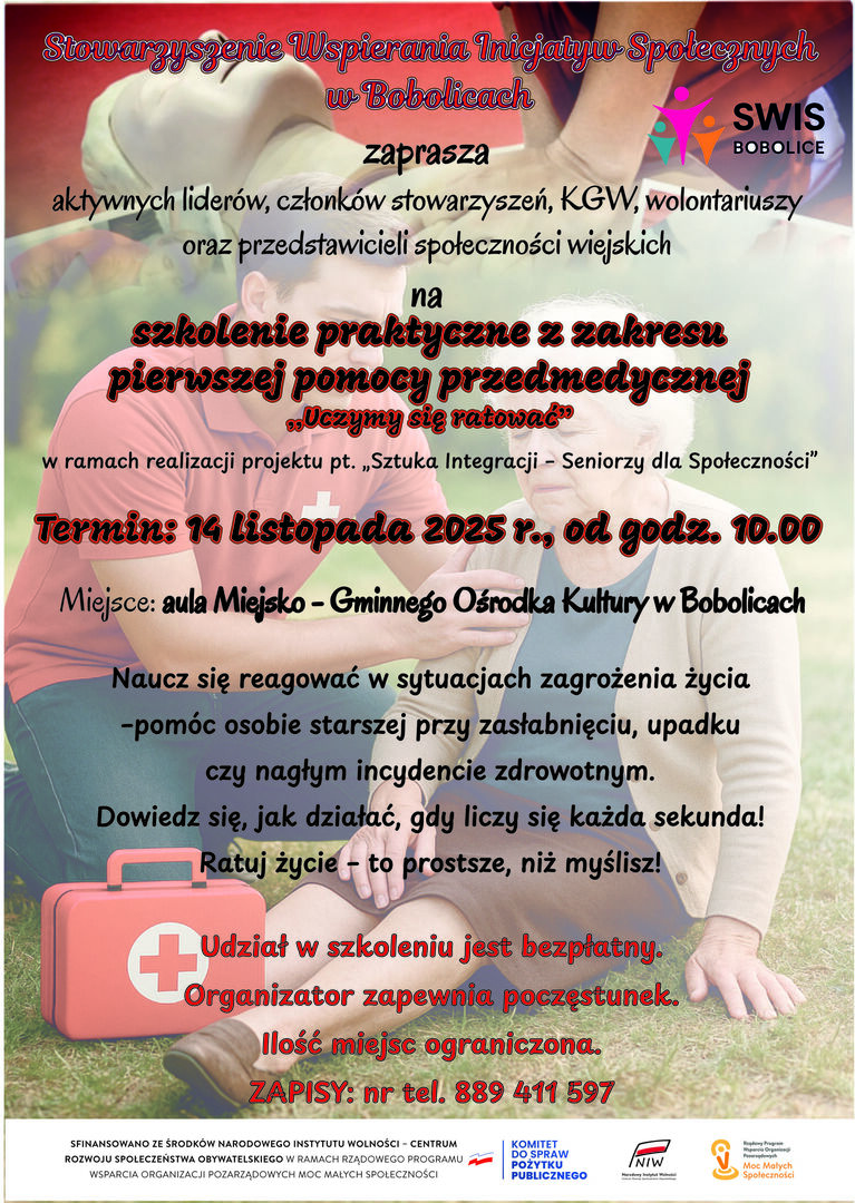 Stowarzyszenie Wspierania Inicjatyw Spo艂ecznych w Bobolicach zaprasza wszystkich aktywnych liderów, cz艂onków stowarzysze艅, KGW, wolontariuszy oraz mieszka艅ców spo艂eczno艣ci wiejskich na praktyczne szkolenie z zakresu pierwszej pomocy przedmedycznej.